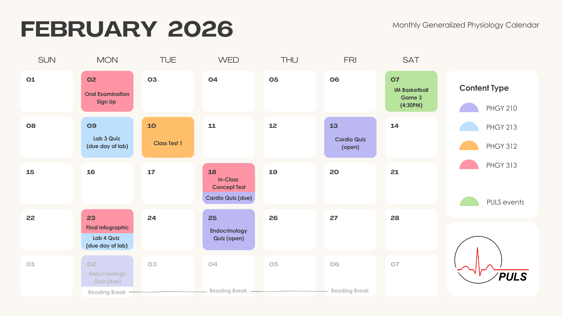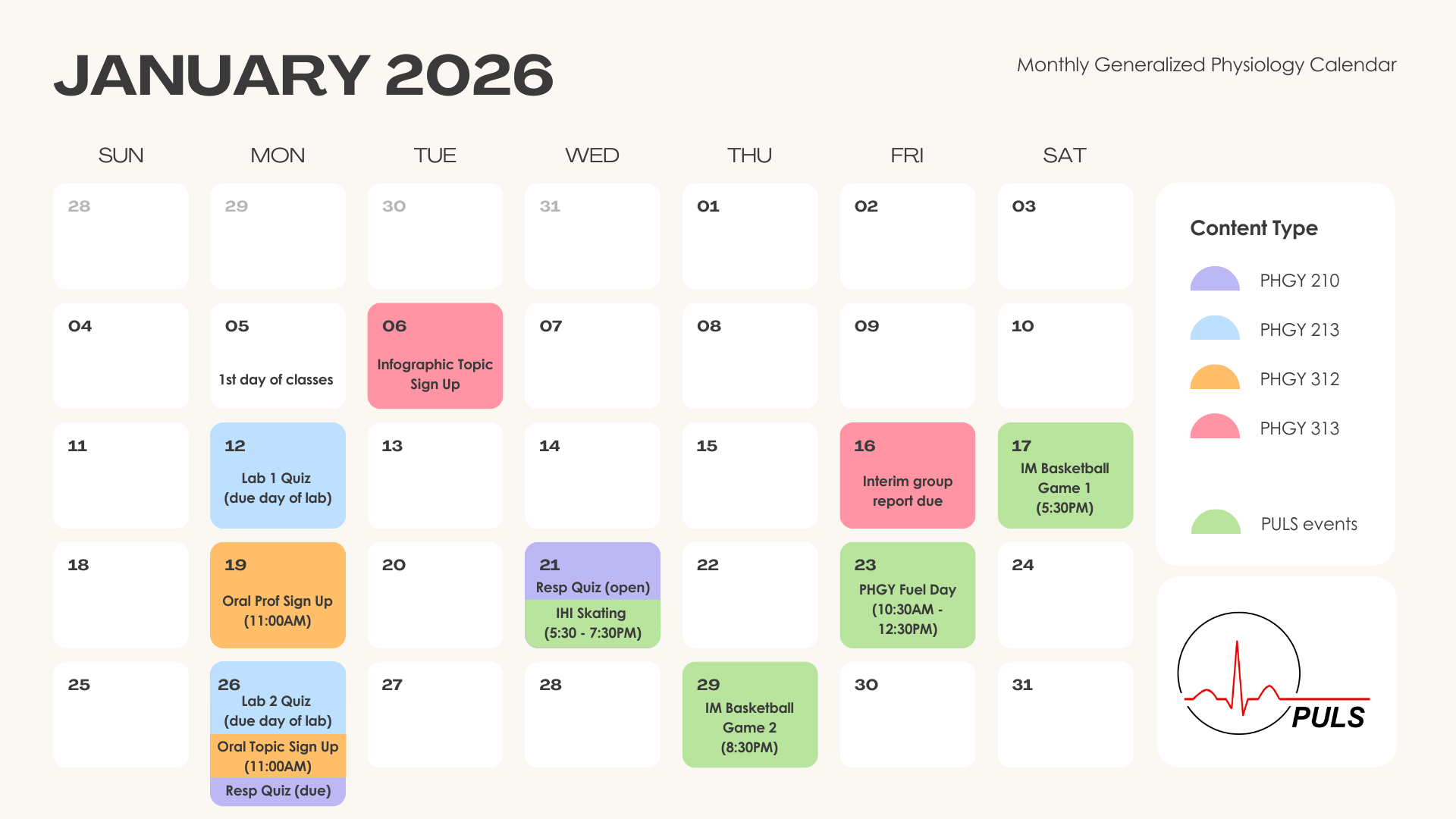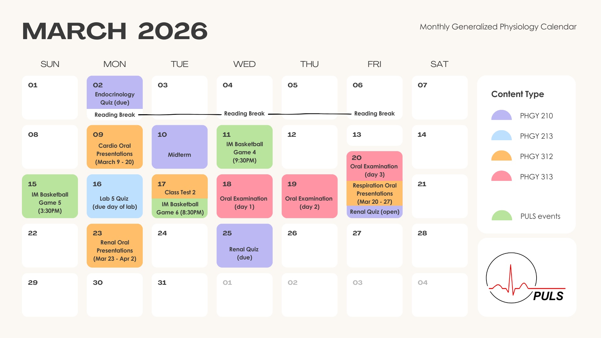 All physiology deadlines and details, in one calendar.